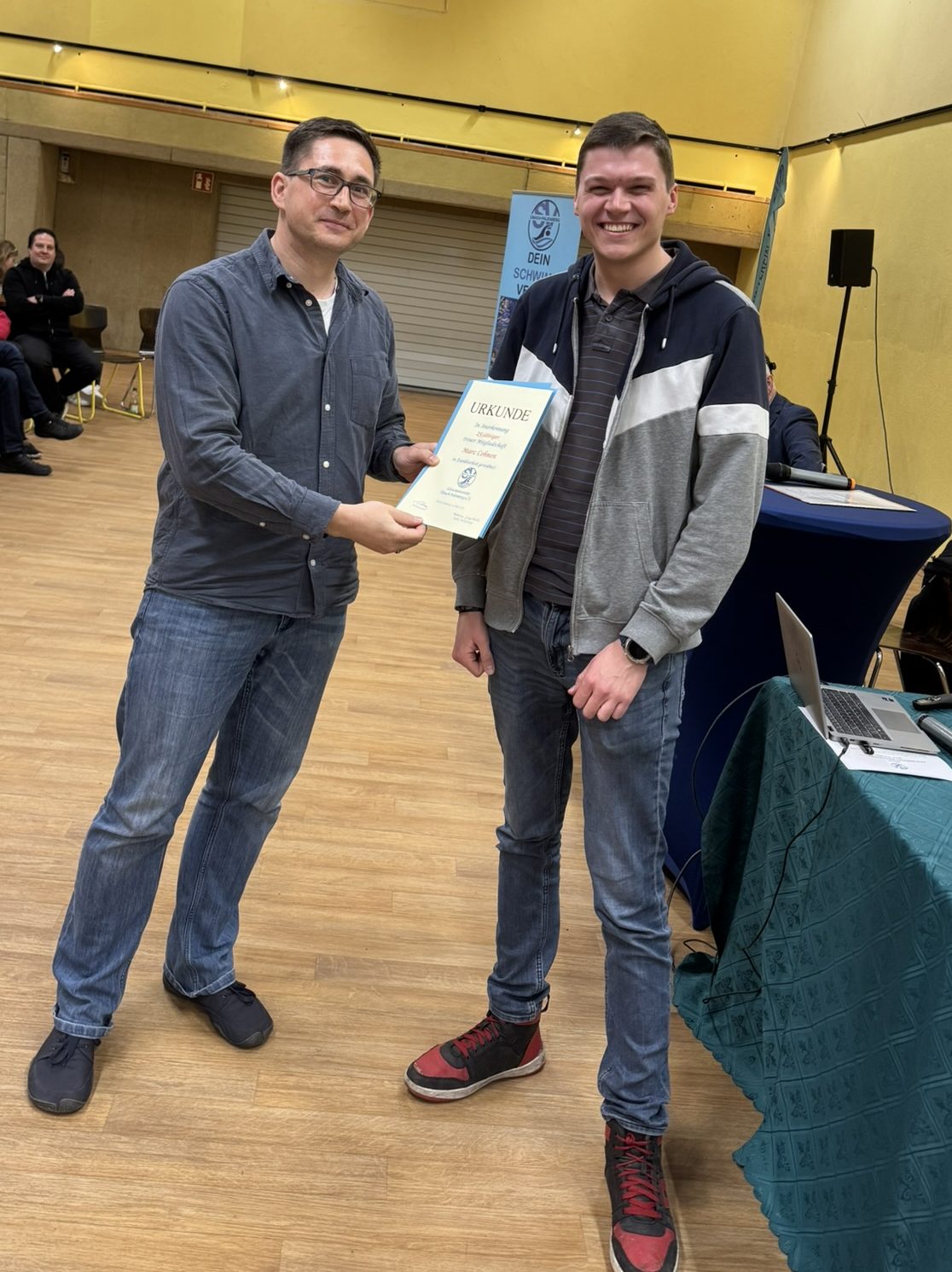 Auch hat Tim besonders auf das „Qualitätssiegel Kinder- und Jugendsport“ hingewiesen. Hierzu fand am 20.12.2025 noch ein notwendiger Workshop statt, in dem ein Vereinsprofil gestaltet wurde. Lohn für diese Arbeit: Der SV Übach-Palenberg wurde am 21.03.2026 als erster Verein im Kreis Heinsberg und als einer der ersten in NRW mit dem Qualitätssiegel ausgezeichnet. Wieder ein Zeichen für die hervorragende geleistete Arbeit der vielen ehrenamtlich tätigen Trainer und Unterstützer. Vielen Dank, dass ihr das Tag für Tag für unseren Verein macht.
